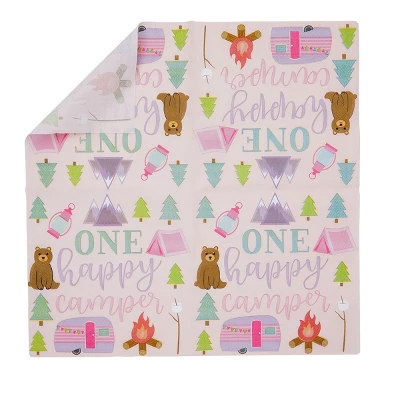 - Camping Birthday Party Supplies: The pink napkins feature grizzly bears, pine trees, and campfire designs with text that reads “One Happy Camper”, excellent for a camping-themed party