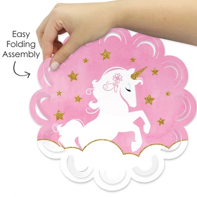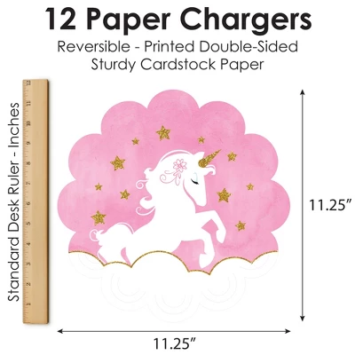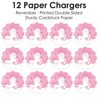 Rainbow Unicorn Paper Chargers INCLUDES set of 12 reversible round table decorations. Create an exciting look at your Birthday Party or Baby Shower when you use paper chargers to elevate your table setting and accent your dinnerware. Tablescape Accent: Rainbow Unicorn chargers will add a festive flare to your tablescape. Whether itβs a large feast gathering or a close-knit gathering with the family, paper chargers will add a splash of color and are a great alternative to paper doilies. Easy Decor: Dress up your table with layers! Add a plate to the center of paper chargers. Magical Unicorn Themed paper charger is an easy solution for your table setting decor and perfect for complementing your tableware. The scallop border can be flared up for an elevated look and the backside can be used for an alternate look. High-Quality Supply: Rainbow Unicorn Paper Chargers are professionally printed double-sided on sturdy cardstock paper with a photo-like shine. Paper chargers measure 11.25β in diameter and are the perfect final touch to complete your Birthday Party or Baby Shower. Made In The USA: Rainbow Unicorn Paper Chargers are designed and manufactured at our Wisconsin facility using materials that are Made in the USA.