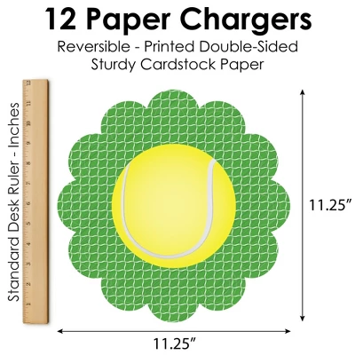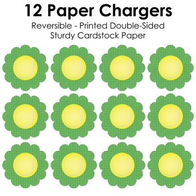 You Got Served Tennis Paper Chargers INCLUDES set of 12 reversible round table decorations. Create an exciting look at your Baby Shower or Birthday Party when you use paper chargers to elevate your table setting and accent your dinnerware. Tablescape Accent: You Got Served Tennis chargers will add a festive flare to your tablescape. Whether it’s a large feast gathering or a close-knit gathering with the family, paper chargers will add a splash of color and are a great alternative to paper doilies. Easy Decor: Dress up your table with layers! Add a plate to the center of paper chargers. Sports Themed paper charger is an easy solution for your table setting decor and perfect for complementing your tableware. The scallop border can be flared up for an elevated look and the backside can be used for an alternate look. High-Quality Supply: You Got Served Tennis Paper Chargers are professionally printed double-sided on sturdy cardstock paper with a photo-like shine. Paper chargers measure 11.25” in diameter and are the perfect final touch to complete your Baby Shower or Birthday Party. Made In The USA: You Got Served Tennis Paper Chargers are designed and manufactured at our Wisconsin facility using materials that are Made in the USA.