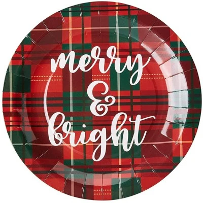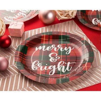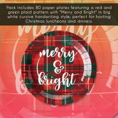 - Holiday Party Decorations: The holiday paper plates feature red and plaid coloring with “Merry & Bright” text printed in the center; ideal for creating a celebratory atmosphere and perfectly coordinated theme
