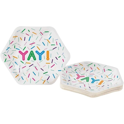 - PAPER PLATES FOR PARTIES: Fun and colorful design plates add a charming touch to dining tables and look like artwork on display. Each plate features YAY! and colorful confetti prints, including silver holographic foil