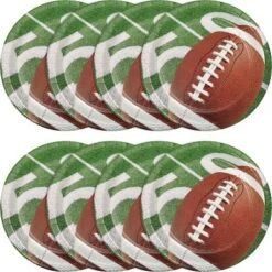 Pass out delicious treats at your party with these Football Party Dessert Paper Plates. The Sturdy Style plates are made of paper and measure 7” round, perfect for all of your snacks and goodies. Each paper plate displays a football sitting on the 50 yard line. The premium strength paper plate comes in packs of 24 and can be combined with other Football Party party supplies.