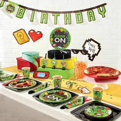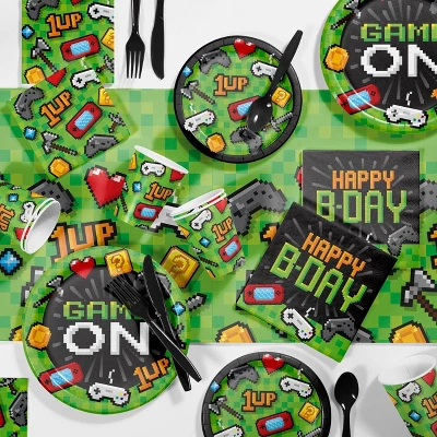 Your guests will know that it’s time to press Start on the food with the Video Game Party Napkins. These napkins measure 6.5″ and feature a black background and says “Game On” with a green pixelated border that is covered in pixelated video game icons like controllers, a sword, a portable gaming system and a “1up”. Sold in packs of 48, these disposable napkins can be coordinated with our other Video Game Party party supplies.