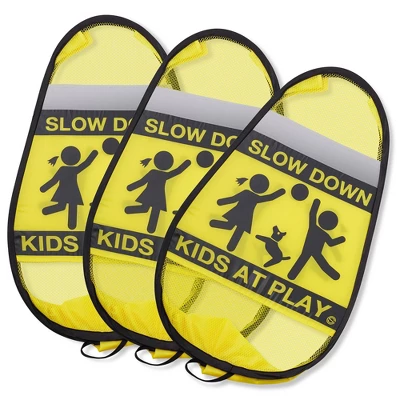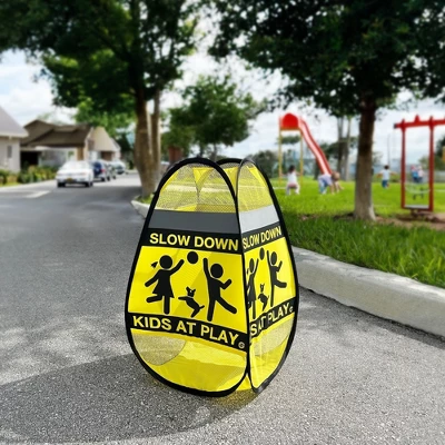 The Dryser four-sided caution Kids at Play signs are an effective tool to enhance the safety of children playing in streets, by alerting drivers to slow down and be cautious. Designed with exceptional brightness and reflectivity to ensure that they are noticeable to drivers, especially in poor lighting or weather conditions. The signs are colored in bright yellow with bold black lettering and graphics, designed to alert drivers effectively. The lightweight design allows for easy set-up in seconds for immediate use and fold down just as quickly for convenient storage with elastic loop to hang or keep sign folded for storage. Contains Pack of 3 signs. Overall dimensions 15” w x 12” d x 24” h