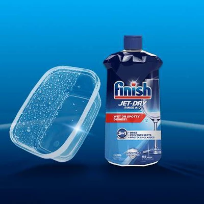 Finish Jet-Dry Rinse Aid has 5x Power Actions and a Glass Protection ingredient for shinier and drier dishes vs. detergent alone. For optimal results, use with your detergents. Experience shiny dishes and spot and film protection (vs. dishwasher detergent alone) with our Finish Jet Dry Dishwasher Rinse Aid. It works with your dishwashing detergent to rinse away stubborn leftover food, spots, and film for sparkling dishes, glasses and utensils. It’s easy to use as well! Simply fill your rinse aid dispenser with Finish Jet-Dry Rinse Aid and it will be automatically released in the rinse cycle every time your dishwasher runs.