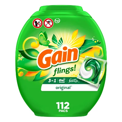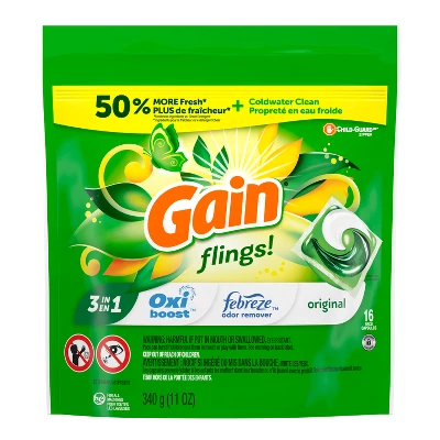 Gain flings! laundry detergent pacs are packed with 50% more scent than Gain liquid laundry detergent. Armed with the stain-fighting power of Oxi and Febreze, they give you nothing but great, clean, amazing-smelling laundry. Use with any laundry set-up, because Gain flings! Pacs dissolve in both hot and cold water and are HE compatible. Gain’s refreshing Original Scent infuses your clothes with the fragrance of the green, clean, airy outdoors, so you’re always just one quick sniff away from the most invigorating scent experience known to humankind.