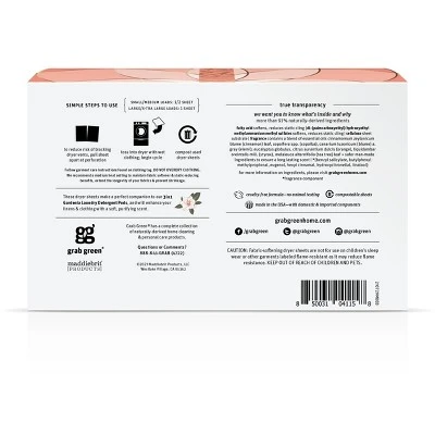 Grab Green Dryer Sheets naturally soften and reduce static cling and wrinkles without unnecessary harsh chemicals. Our relaxing lavender with vanilla fragrance is made with lavender, lavandin, patchouli and eucalyptus essential oils. These sheets are also compostable and will biodegrade and compost in municipal and industrial facilities. We responsibly source the highest quality plant and mineral-based ingredients and work directly with our team of organic chemists to create the most effective, naturally-derived, non-toxic formulas. Thoughtful packaging includes clear use instructions. We believe in full ingredient disclosure—what we call True Transparency—which is why we list every ingredient and the purpose for each ingredient on every package. Grab Green is a female and mother owned and operated company that provides naturally derived and non-toxic laundry, home cleaning, and personal care products 100% made in the USA. Our products are eco-responsible and ensure safe and effective cleaning power for a healthy, happy home.
