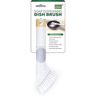 - BAMBOO SOAP DISPENSING BRUSH WITH SCRAPER ON BACK FOR CAKED ON FOOD SCRAPS. Compatible with Dawn, Gain, Method, Palmolive or other liquid detergent with a strong scraper to get the toughest scraps off