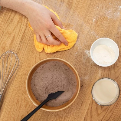 - 6x MICROFIBER WASHCLOTH: 2x red, 2x blue and 2x yellow (12in). A high-quality material ensures gentle cleaning of smooth surfaces. Use the kitchen set damp or dry, without cleaning product