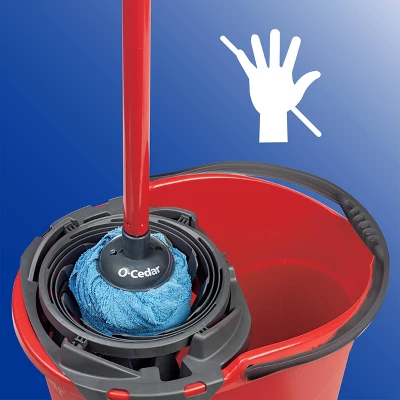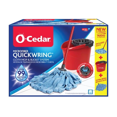 This O-Cedar Microfiber Cloth Wet Mop with the Quickwring Bucket System features super absorbent strands that attract dirt, dust, hair and moisture, while our unique microfiber technology lets you clean effectively with just water or vinegar. This mop is ideal and safe for cleaning all hard surfaces, including hardwood, linoleum, laminate, and tile floors. The sturdy three-piece steel handle is 47” in length when fully assembled for maximum reach and cleaning abilities without getting on your hands and knees. The bucket features a special wringer that thoroughly wrings out excess water, keeping hands clean and dry. Our bucket holds up to 2.5 gallons and features integrated spout for easy pouring to avoid spills. The wringer is removable for simple clean up and storage. The complete mop and bucket system also includes one extra mop refill. Assign each room in your home its own refill and avoid spreading dirt from one area to another. Stock up ahead of time so you’re always ready for the next mess. Whether you are cleaning spilled drinks or after a pet, do it with this super-absorbent O-Cedar mop and bucket system.