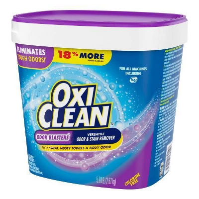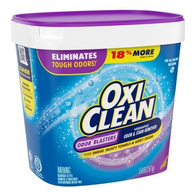 Harness the power of oxygen to remove tough stains and odors with OxiClean Odor Blasters Versatile Odor and Stain Remover Powder from America’s #1 stain remover additive brand(1), tackles big and small stains and odors, for laundry and home. This oxygen-powered, chlorine-free, color-safe laundry stain remover and odor remover helps remove stubborn smells and stains from machine-washable clothing, sheets, towels, workout clothes, shoes, team uniforms, and pet bedding, attacking tough odors like musty towels, body odor and sweat so items smell clean and refreshed. For best results, presoak items in a mixture of OxiClean powder stain cleaner and water following label directions. Then add powder per label directions to the washer, add items, and wash with detergent. Safe to use as a laundry booster in HE and standard washing machines. OxiClean Odor Blasters Versatile Odor and Stain Remover is not just for clothes. Mix with water as directed on label to eliminate odors from machine-washable fabrics and remove stains from hard surfaces in the kitchen, bathroom, and around the home. This 5 lb container is enough for big or small messes. From stain removers and laundry boosters to household cleaners and much more, OxiClean offers a product to fit your needs. (1) Based on units sold