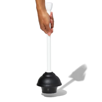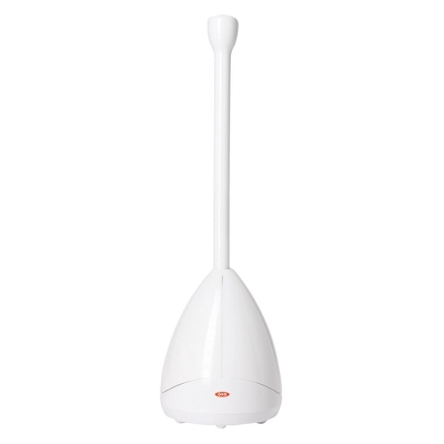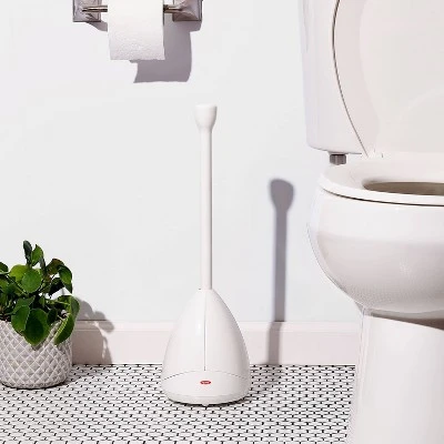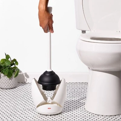 The OXO Toilet Plunger and Canister is designed to open when you lift the Plunger and close when you replace it for neat and hassle-free plunging. The flat-top handle provides a secure, comfortable grip while you work. The Plunger head works on all toilets, including low-flush models. The ventilated drip tray contains any excess water and allows it to evaporate. The tidy Canister keeps the Plunger out of sight when not in use.