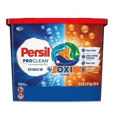 - This package includes one laundry detergent container of 59 Persil ProClean Discs plus Oxi Power laundry detergent pacs, enough 59 loads of laundry