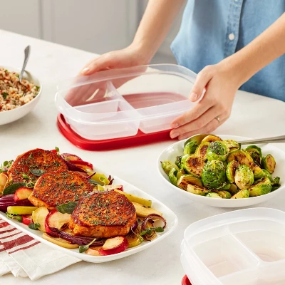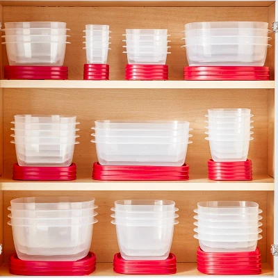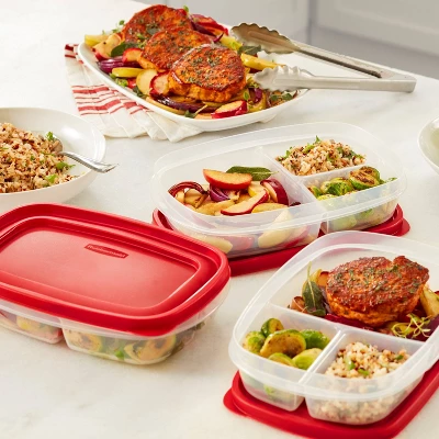 Easily store food and minimize kitchen clutter by using Rubbermaid Food Storage Containers with Easy Find Lids. These meal prep containers are easy to organize and help save space in your cabinets, and the 3-, 5-, and 7-cup sizes even feature a built-in lid vent for splatter-resistant microwaving. The bright red lids also snap to each other and to the bottom of the containers, so they’re always easy to find. Constructed from durable, BPA-free plastic, these food containers are built to withstand a wide range of temperatures and are dishwasher and freezer safe, while the vented containers are fully microwave safe when the vent is opened. Plus, thanks to their clear bases, it’s easy to see what’s inside.