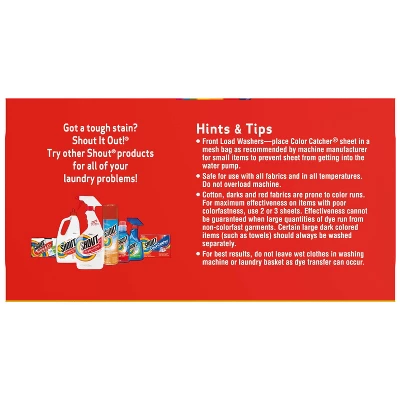 Keep the color of your clothes as bright and vibrant as your energy. Shout Color Catcher Dye-Trapping Sheet absorbs and traps loose dyes in your wash water, protecting your clothes against damage from color bleeds and helping preserve those vibrant original colors. Safe for all colorfast washables and works in all water temperatures. Shout Color Catcher Dye-Trapping Sheets save you time and money allowing mixed wash loads and preventing color runs. The proof is on the Sheet!