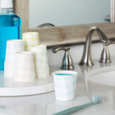 Use this set of 100 gingham paper cups to conveniently rinse and gargle mouthwash while you brush your teeth at home, in the office, or while at school. The small bathroom cups each measure 2.35 x 2.35 inches with a 4-ounce capacity and internal coating to ensure liquid does not leak out. Use the small disposable cups for espresso shots or liquor shots too.