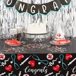 - Nurse Graduation Party Supplies: Instantly elevate your nurse party decorations with our set of 3 plastic table covers; the festive nurse equipment’s prints on the front will effortlessly complement your graduation event; the tablecloths say “congrats”