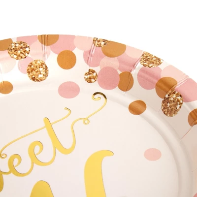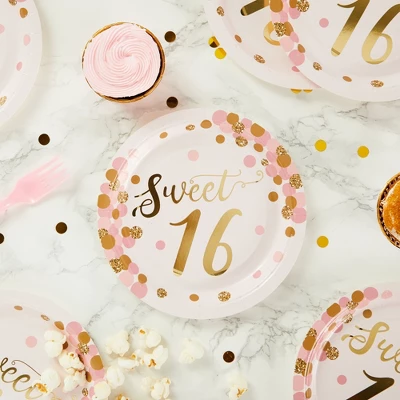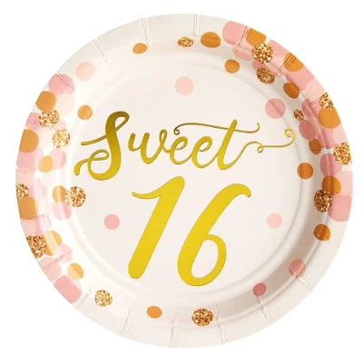 - Sweet 16 Party Plates: Our sweet sixteen paper plates are the perfect addition to your party supplies; the polka dot plates feature pastel pink and gold accents