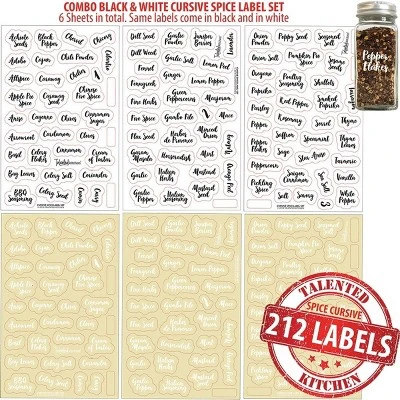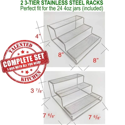Spice Rack 3-tier Shelf Rack Talented Kitchen 24 Jar Set Upgrade your spices with a classic design and premium quality materials. Commercial grade glass large size jars (4 fl oz capacity) Organize your spices and enjoy the extra room on your counter or pantry. Specially useful for small kitchens where counter space is a premium. A Truly Complete Set W/Exclusive Components: 2 different types of preprinted spice labels: Cursive script clear labels and also black chalkboard labels and our magnetic measurement conversion chart w/invaluable info at your fingertips are 3 of the exclusive components this set includes. 2 stainless steel 3-tiered shelf racks to fit your 24 glass jars. The nested racks can expand up to 20” wide. 24 Premium Quality, Heavy Duty Glass Jars. Empty glass jars, 4oz capacity jars Glass jar dishwasher-safe2 drawer tray racks, non-skid24 Silver Metal Caps with Liner for an airtight seal24 Sift & Pour Shakers, Snap-On (W/small holes. rice won’t go through) 12 Extra coarse shakers212 Preprinted Cursive Script Spice Labels in Black and in White126 Preprinted Round Chalkboard Spice Labels Silicone Funnel, Collapsible Magnetic Kitchen Measurement Conversion Chart, size 7 x 5″. Includes weight, liquid & temperature conversions. Script Combo Set 212 clear spice labels96 most common spice names + blank stickersClear with large black and white font (same names both colors). Back adhesive Chalkboard Set 126 chalkboard spice labels96 most common spice names + 18 blank stickers to write your own + numbers + pantryBlack chalkboard material w/white fontSize: round, 1.5″ diameter.
