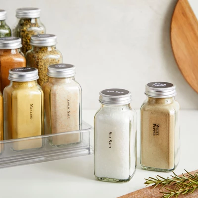 - 6 oz Spice Jars: Our 6 oz spice jars with lids and labels come with airtight metal caps, coarse and sift-and-pour shakers, a silicone funnel for easy pouring, a magnetic conversion chart, and multiple spice label options in 2 styles allowing you to create a uniform and organized look in your kitchen