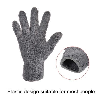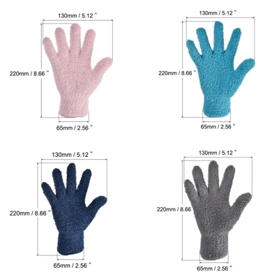 Microfiber gloves have a natural positive electrostatic charge, which can absorb dust and be fixed in soft fibers, so you can clean dust and remove dirt easily and quickly.Package Content: 1 Pair x Blue Gloves, 1 Pair x Dark Blue Gloves, 1 Pair x Gray Gloves, 1 Pair x Pink Gloves.Made of Microfiber, a polyester and nylon (polyamide) fiber that is used to make fabric.Microfiber is split many times smaller than a human hair, which makes it a perfect tool for cleaning and dust removal because it is able to penetrate cracks and crevasses that cotton cloths or paper towels are not able to clean.Length: 220mm / 8.66 inch.Width: 130mm / 5.12 inch.Glove Sleeve Width: 65mm / 2.56 inch.Stretchable design, soft material, and reusable.These dust removal gloves will not leave scratches on the surfaces, reduce indoor and outdoor cleaning time.Wear gloves to wipe dirty areas. The dusting gloves are applied to clean house window, glasses, cabinets, furniture legs, , chair backs, picture frames, and other areas.The flexible size design is suitable for most people.