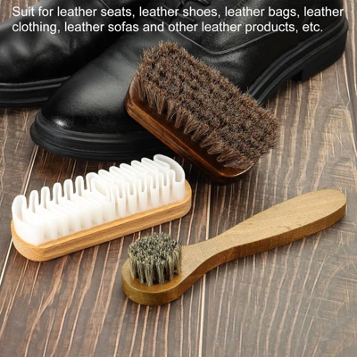 The horsehair shoe brush effectively cleans leather seats, leather shoes, leather bags, leather clothing, leather sofas, and other leather products, or high-end clothing, etc. Play a role in promoting absorption removing excess leather care products, and polishing. Specially designed for shoemakers. Specification: Long Handle Shoes Brush:Color: Brown;Material: Wood, Horsehair;Horsehair Length: 17mm / 0.67 inch;Brush Head Diameter: 40mm / 1.57 inch;Total Length: 170mm / 6.69 inch; Handheld Shoes Brush:Color: Brown;Material: Wood, Horsehair;Horsehair Length: 28mm / 1.1 inch;Brush Head Width: 50mm / 1.97 inch;Total Length: 107mm / 4.21 inch;Suede Shoes Brush: Color: Wooden Color;Material: Wood, Rubber;Rubber Length: 120mm / 4.72 inch;Brush Head Width: 43mm / 1.69 inch;Total Length: 128mm / 5.04 inch;Package Contents: 3in1 Set x Shoe Brushes;Advantage:The shoe brush has good softness, and certain elasticity, is not easy to deform, is not affected by cold and heat, is anti-static, and is not easy to age. Instruction:1. Wet the hair before use, which can prevent the hair from smoothly.2. After use, hang to dry and store in a cool place to avoid squeezing the hair. Notice:Before using a new brush for the first time, soak the horsehair in warm water, then gently stroke the hair with fingers, which can basically avoid hair loss during use. Do not mix care products of different colors, so as not to affect the color difference.